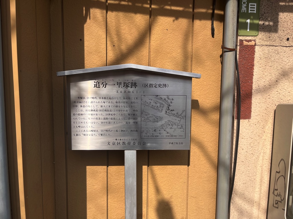 ちょうど、中山道と日光御成道が分かれる交差点となります。追分にかつては一里塚があり、その跡として立札が設置されています。